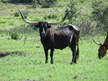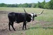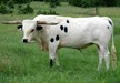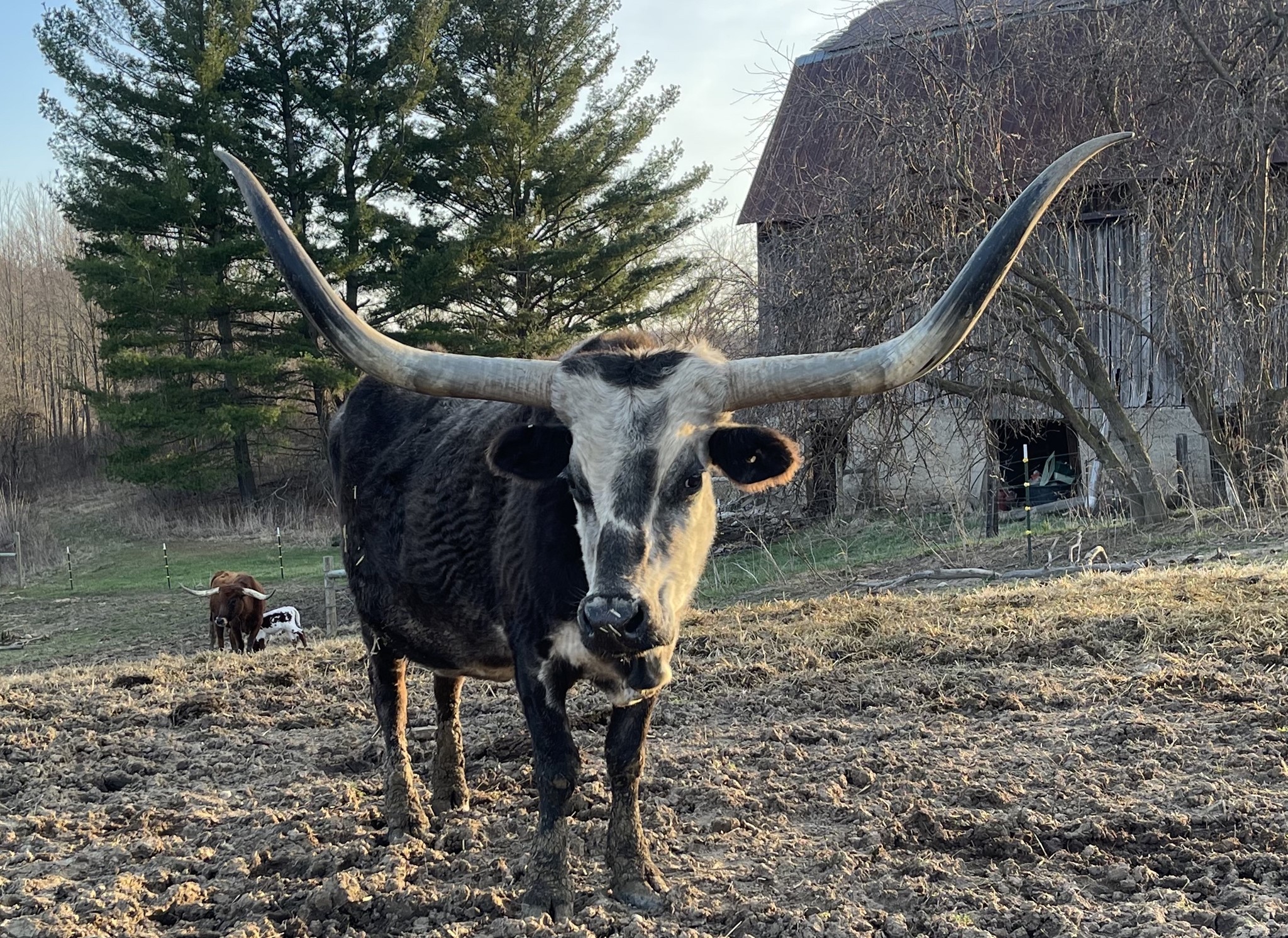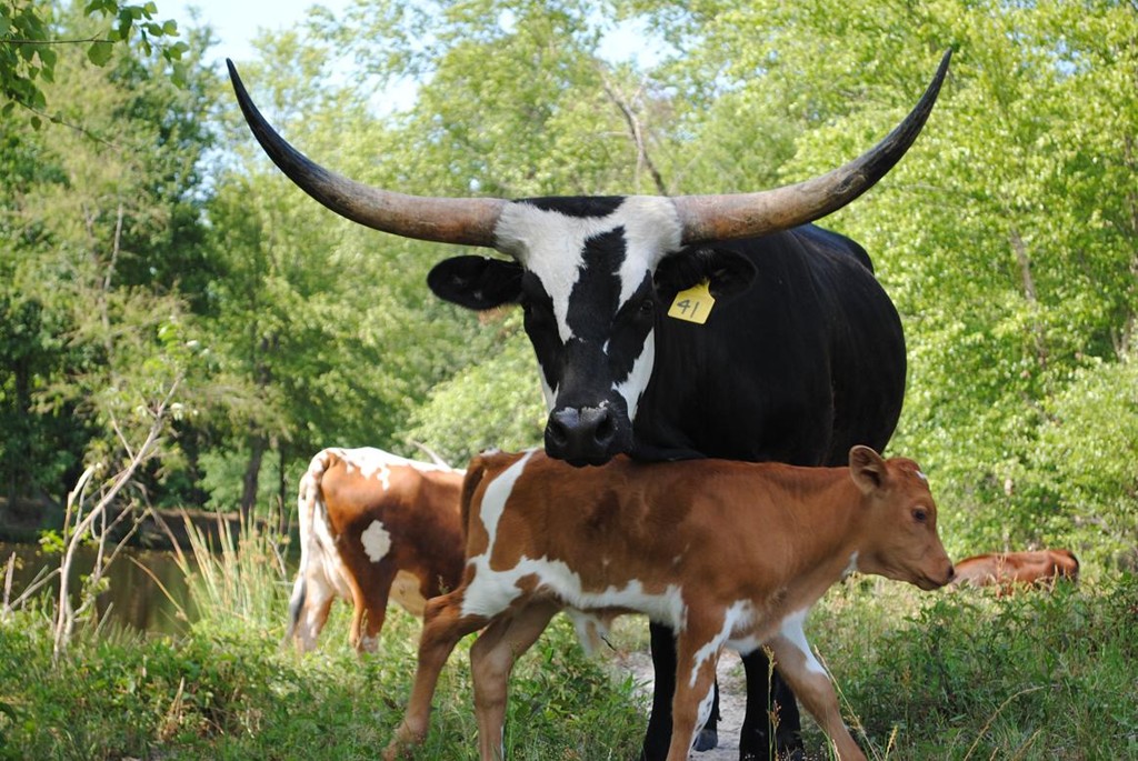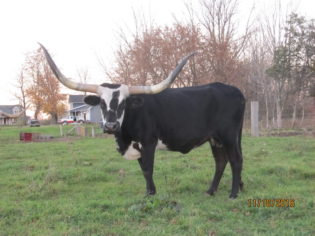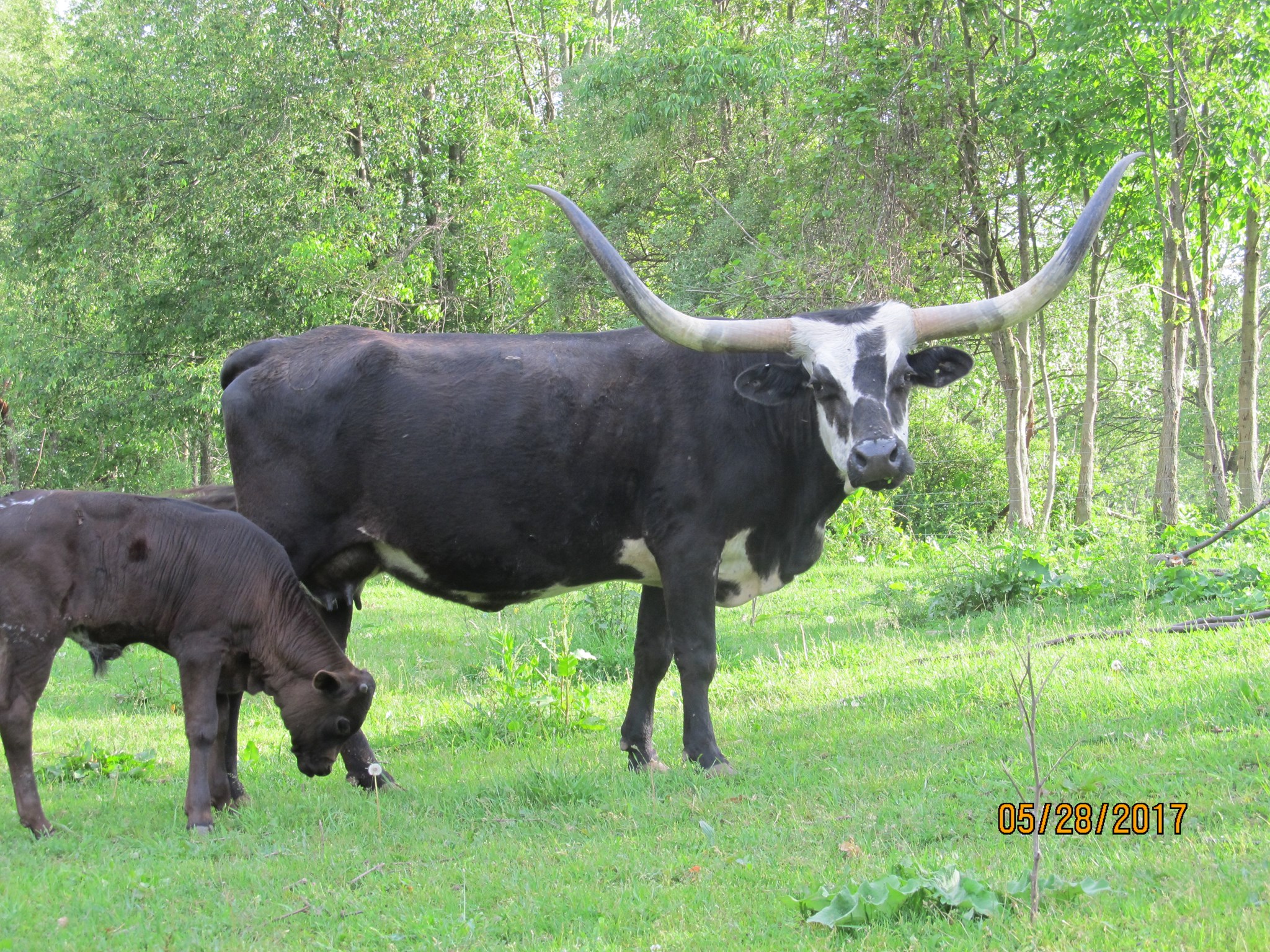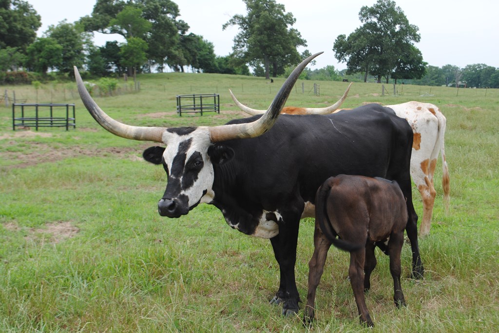 Island Girl is one our first Longhorns and has found her forever home. She has given us three black and white calves that are stout and stand out in the pasture. She continues to impress us with her calves.